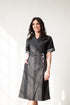 Sukně je lehce áčková a asymetricky střižená, což přidává šatům nejen pohyb a dynamiku, ale dodává vzhledu i netradiční efekt. Nechybí ani praktické kapsy, které se přirozeně začlení do linie střihu a výrazné boční knoflíky na zavinovacím zapínání, které slouží nejen funkčně, ale i jako stylový akcent.