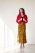 Jejího lehce zvonového tvaru je dosaženo šikmým střihem látky, který umožňuje, aby sukně splývala a jemně kopírovala křivky těla. Díky elastickému pasu s gumou šikovně všitou dovnitř si sukně zachovává hladký a čistý vzhled a zároveň získává na praktičnosti.